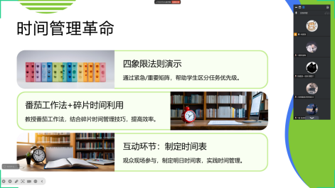 活动中,2025届毕业班辅导员详细讲解了时间管理的重要性和实用技巧。通过“四象限法则”演示,帮助学生区分任务优先级;结合“番茄工作法”,教授如何高效利用碎片时间。