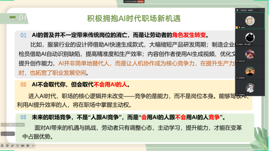 活动中,辅导员围绕AI技术对职场的影响展开讲解,随着人工智能的快速发展,传统岗位需求正在发生变化,新兴职业需求旺盛,毕业生应主动适应技术变革,加强数据分析、编程、自动化控制等技能的学习,同时培养创新思维和跨领域协作能力,以增强就业优势,拓宽职业发展空间。