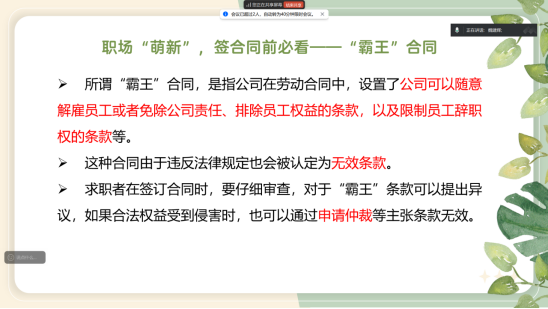 针对毕业生在求职过程中可能遇到的法律风险,辅导员特别强调了劳动合同签署的注意事项,并结合真实案例,详细分析了“霸王”合同、“竞限”合同、“阴阳”合同、“抵押”合同、“空白”合同五类常见问题合同,提醒毕业生在签约前应仔细审阅合同内容,必要时咨询学校就业指导中心或法律专业人士,确保自身权益不受侵害。