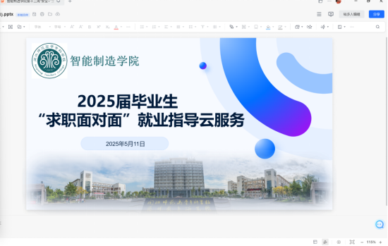 5月11日,智能制造学院开展2025届毕业生“求职面对面”就业指导云服务活动(第十一期),本次活动以“积极拥抱AI时代职场新机遇”为主题,旨在帮助毕业生把握人工智能时代的就业趋势,提升职业竞争力,同时增强法律意识,防范求职陷阱。