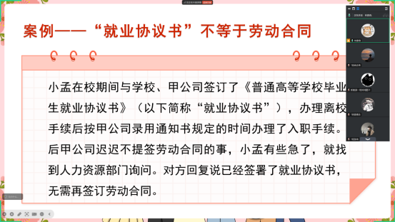 随后,辅导员们进行就业权益保护知识宣讲。通过具体案例剖析毕业生在求职过程中可能遭遇的合同陷阱、薪资纠纷、虚假招聘等问题。强调毕业生在签订就业协议和劳动合同时,要仔细阅读条款内容,明确双方权利与义务,警惕不合理条款。同时,还分享了遭遇侵权时的维权途径和方法,如向劳动监察部门投诉、申请劳动仲裁等,为毕业生的就业之路筑牢法律防线。