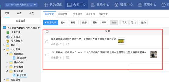 2、示例:导入到站点“现代教育技术中心”中的栏目“科普长廊”。