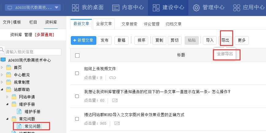 1、在“内容中心”页面中,左侧菜单栏选择相应的“栏目”,在右侧可以勾选相应新闻后选择“导出”,或者直接下拉选择“全部导出”。