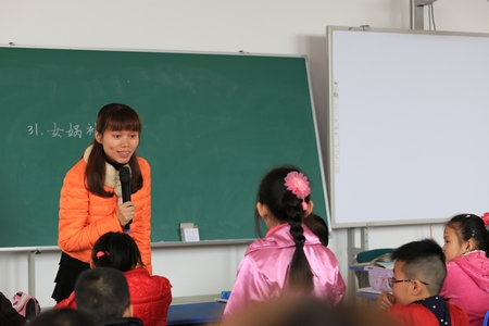 第二堂课是福州市金山小学的黄艳老师上的一堂奇妙无比的三年级课文《女娲补天》。黄老师引导学生通过想象领悟当时人类的疾苦以及女娲为拯救人类所付出的艰辛,并让学生扮演女娲请求雨神降雨进行写话练习。