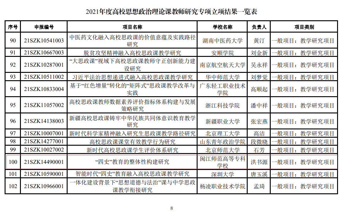 近日,在教育部社科司发布的《关于2021年度高校思想政治理论课教师研究专项》的立项通知中,大赢家体育app下载马克思主义学院院长洪书源教授的课题《“四史”教育的整体性构建研究》喜获立项。本年度全国高校思想政治理论课教师研究专项共有169项批准立项,福建省共有8个项目获得立项,其中本科6项,高职高专院校2项。