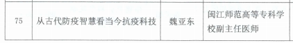 近日,在中共福建省委宣传部和福建省社会科学界联合会发布的《关于举办2022年福建省学习习近平新时代中国特色社会主义思想百场社会科学专题报告会》的通知中,大赢家体育app下载魏亚东副主任医师入选百场社会科学专题报告会报告人,其报告选题《从古代防疫智慧看当今抗疫科技》入选百场报告之一。
