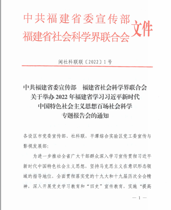 为了充分发挥社科界专家学者在理论武装工作中的重要作用,以实际行动迎接党的二十大胜利召开,省委宣传部、省社科联组织开展2022年福建省学习习近平新时代中国特色社会主义思想百场社会科学专题报告会,以期推进理论武装工作进企业、进农村、进机关、进校园、进社区、进军营、进网络,实施“提高效率、提升效能、提增效益”行动。