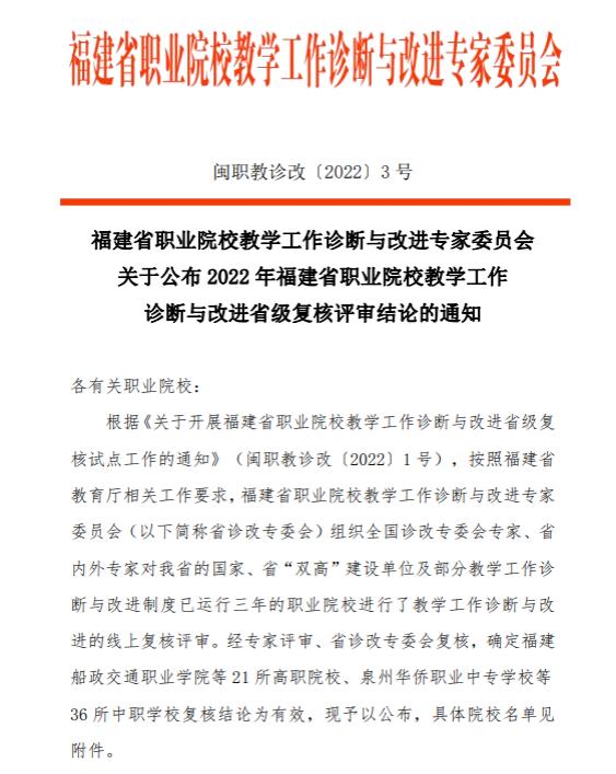 日前,福建省职业院校教学工作诊断与改进专家委员会发布《福建省职业院校教学工作诊断与改进专家委员会关于公布2022年福建省职业院校教学工作诊断与改进省级复核评审结论的通知》,大赢家体育app下载教学工作诊断与改进复核结论为“有效”,标志着学校教学工作诊断与改进工作取得了阶段性成果。