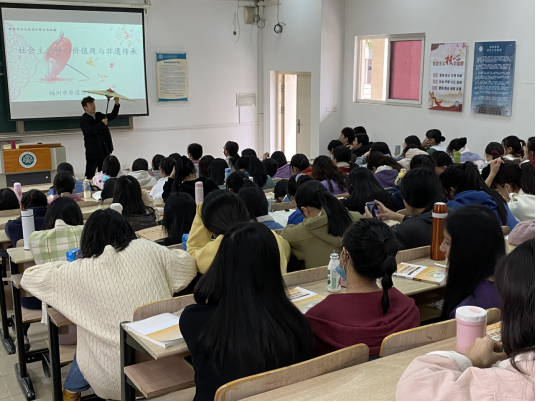 2020年9月,为了推动“思政课程”向“课程思政”立体化育人模式转型,马克思主义学院与福州市福伞文化发展有限公司积极合作,共同建设中华优秀传统文化传承实践基地。2021年1月5日,我院以课堂教学为切入点,将非遗文化纳入《思想道德修养与法律基础》教学过程。邀请“福州油纸伞”制作技艺代表性传承人严磊走进思政课堂,为大学生讲述社会主义核心价值观与非遗文化的传承故事。