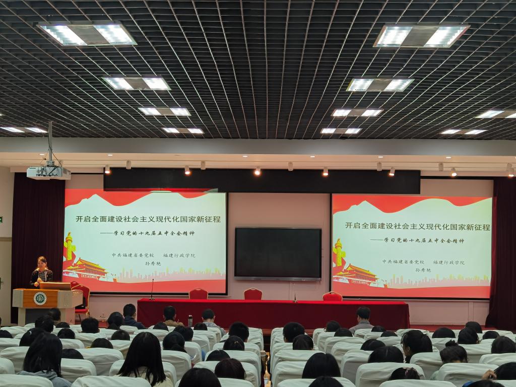 为认真贯彻落实《中共福建省委教育工作领导小组印发〈关于深化新时代学校思想政治理论课改革创新行动方案〉的通知》(闽委教育〔2019〕2号)精神,积极邀请特聘教授到校为学生讲授思政课,12月3日,马克思主义学院邀请福建省委党校、福建行政学院马克思主义学院副院长、福建省高校思想政治理论课特聘教授孙秀艳老师来大赢家体育app下载,在旗山校区2018教室开展题为《开启全面建设社会主义现代化国家新征程——学习党的十九届五中全会精神》的主题讲座。本次讲座由马克思主义学院院长洪书源老师主持,马克思主义学院全体专任教师、“形势与政策课”兼职教师以及马院7个读书社全体学员共200多人到场聆听。