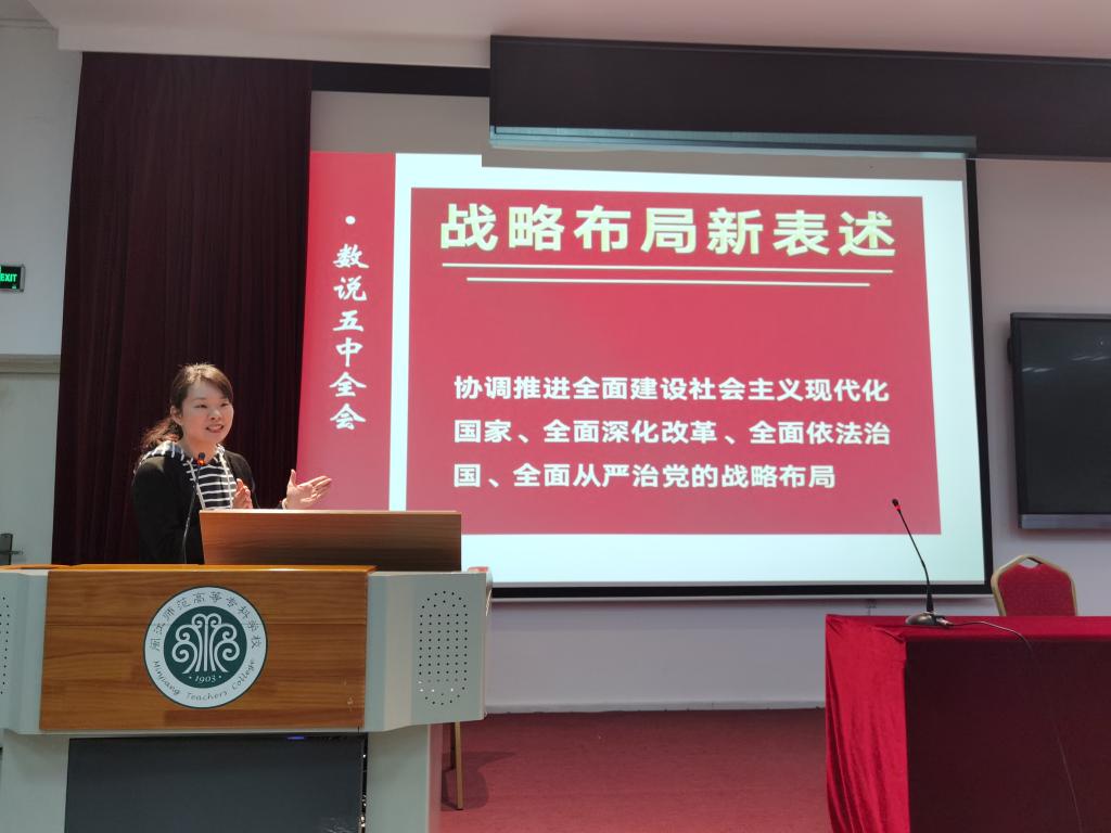 首先,孙教授用“1234569”七个数字概括性地阐明党的十九届五中全会七个主要内容:一个主题,两件大事,三个“新”,四个全面,五大理念,六个近期目标及九个中长期目标,帮助师生们对党的十九届五中全会有一个总体上的把握和认识。