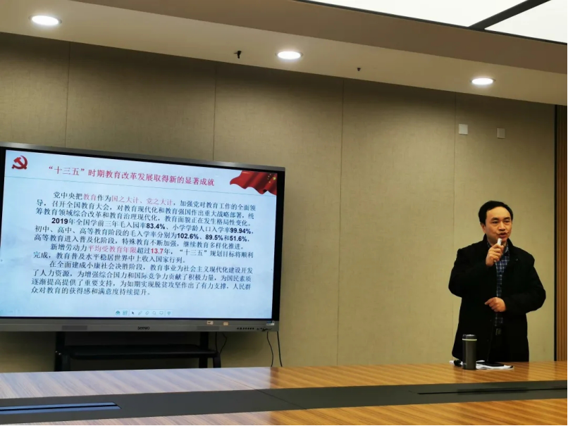 宣讲会上,洪书源老师首先紧扣规划《建议》,用“54321”和“1234569”两组数字快速解读十九届五中全会的重要精神和核心内容;接着,他先后解读规划《建议》中对教育的重要阐述,十三五以来我国教育的决定性成就以及十四五期间我国教育面临的十大任务;最后,他结合习近平总书记教育重要论述,提出以习近平教育重要论述所蕴含的重要思想为指导,涵养为师之德,牢记育人之责,当好学生锤炼品格、学习知识、创新思维、奉献祖国的引路人,为全面建设社会主义现代化教育强国作出积极的贡献。专题宣讲主题鲜明,立意深远,从理论的高度全面解读十九届五中全会精神,结合习近平总书记关于教育重要论述,从实践的维度进行阐释,让在场的老师们受益匪浅。