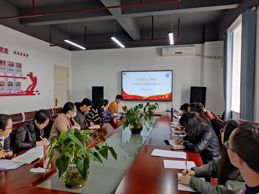 12月15日上午,马克思主义学院在旗山校区党建活动中心组织学习陈炜同志先进事迹,会议由院长洪书源主持,学院全体教师参加。