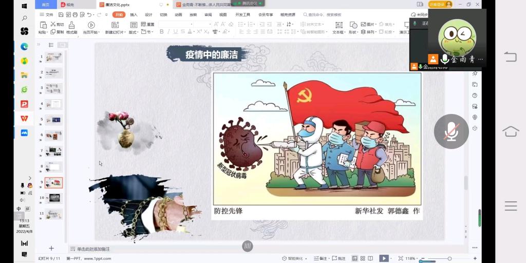 4月8日中午,青年马克思主义协会(读书社)在腾讯会议线上开展“我们身边的廉洁文化”主题活动,本次活动由指导老师金雨青主讲,读书社全体成员参与。