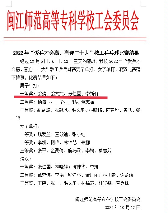10月5日下午,在举行简单的开幕式之后,男单项目第一阶段小组循环赛开始,翁文纯老师发挥出色,以良好的竞技状态夺得小组第一名,顺利晋级八强。6日下午,男单项目淘汰赛拉开战幕,翁老师再接再厉、奋勇争先,八进四、四进二,经过激烈角逐顺利进入决赛,最终获得一等奖。