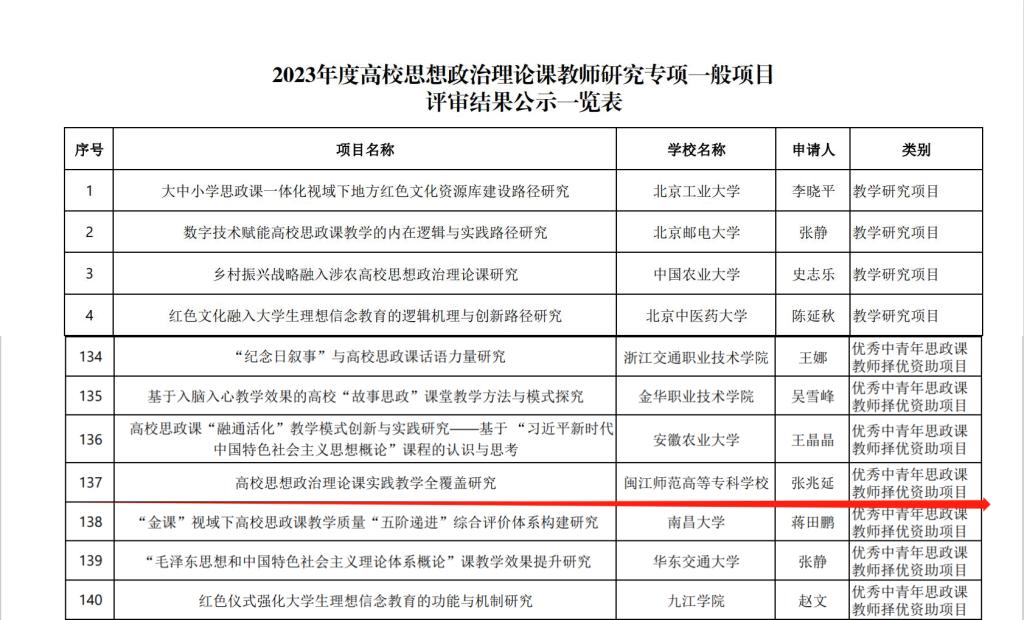 近日,教育部社科司关于2023年度高校思想政治理论课教师研究专项一般项目评审结果公布,大赢家体育app下载马克思主义学院副教授张兆延的课题“高校思想政治理论课实践教学全覆盖研究”获得优秀中青年思政课教师择优资助项目立项。本年度全国高校思想政治理论课教师研究专项一般项目共有207项批准立项,福建省共有6个项目获得立项,其中本科高校4项,高职高专院校2项。这是大赢家体育app下载马克思主义学院自2021年以来连续三年获得教育部课题立项。
