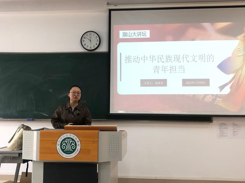11月20日,旗山大讲坛在仓山校区开讲,金雨青老师为智能制造学院学生做题为“推动中华民族现代文明的青年担当”的专题讲座。她从“何以中国:探源中华文明”、“何以有为:赋能中国式现代化”以及“何以自信:肩负文化使命”三个维度,重点阐述推动中华民族现代文明的重要意义、中华文明的突出特性、推动中华民族现代文明与中国式现代化的关系以及青年学生如何肩负起文化使命。金雨青老师表示,迈上新征程,作为新时代的青年要勇于承担时代赋予的文化传承发展重任,积极推动中华民族现代文明。