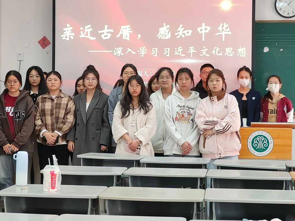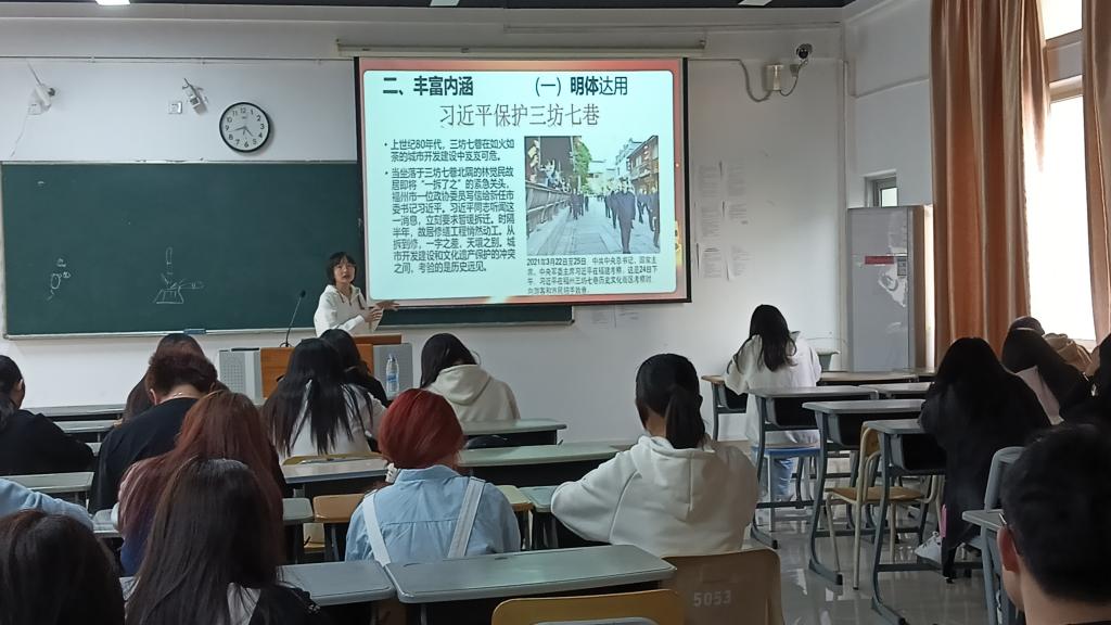陈老师从习近平文化思想的重大意义、丰富内涵以及大学生学习贯彻习近平文化思想的实践要求三方面宣讲。在宣讲中,陈老师认真讲述习近平在福建工作期间对三坊七巷的保护和对武夷山申报世界文化和自然“双遗产”给予高度重视的故事,同时对照当下福建保护文化遗产、支持文化产业的有力举措,激励同学们持续加强对习近平文化思想的学习,坚定文化自信,秉持开放包容,坚持守正创新,为社会主义现代化强国建设贡献智慧力量。