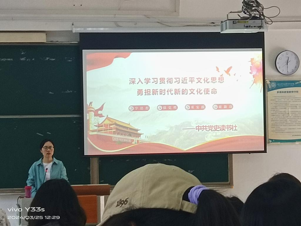 3月25日,在旗山校区1014教室,指导老师穆亮红以“深入学习贯彻习近平文化思想 勇担新时代新的文化使命”为主题,为学生中共党史读书社全体社员做专题讲座。穆老师从“深刻认识习近平文化思想的重大意义”“准确把握习近平文化思想的鲜明特征”“深入学习宣传贯彻习近平文化思想”三个方面展开阐述,引导全体社员用文化自信提振精气神,自觉承担起新的文化使命,为建功新福建贡献自己的力量。