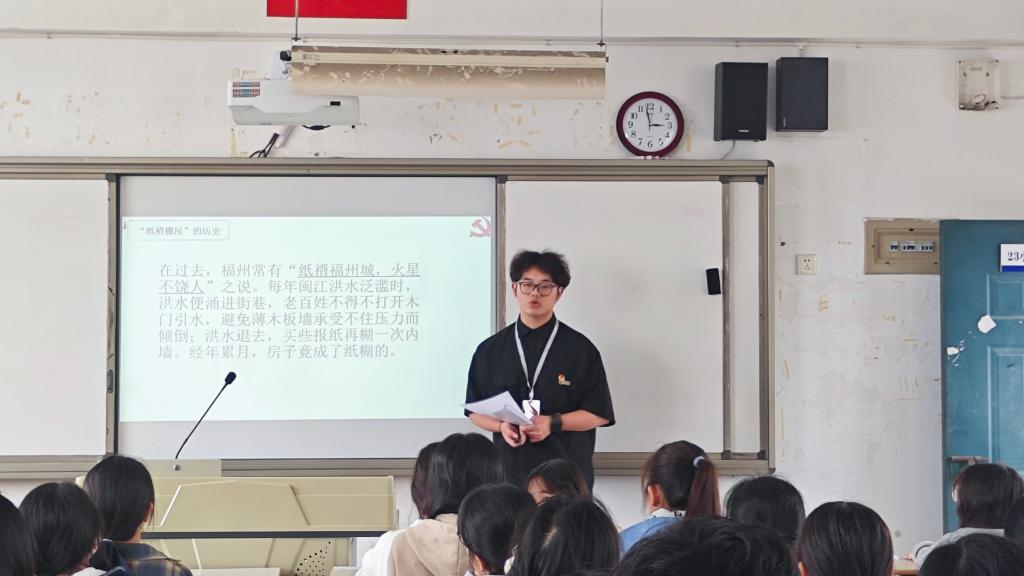 王世尧同学以“纸禙福州城,火星不饶人”的俗语开篇,向同学们描述了20世纪90年代的苍霞实景,还原了棚户区人民艰苦的生活状况。他指出,习近平总书记始终坚持以人民为中心,正是二十多年前他许下的掷地有声的承诺,开启了苍霞社区从棚户区到新城、再到示范社区的“蝶变”之路。