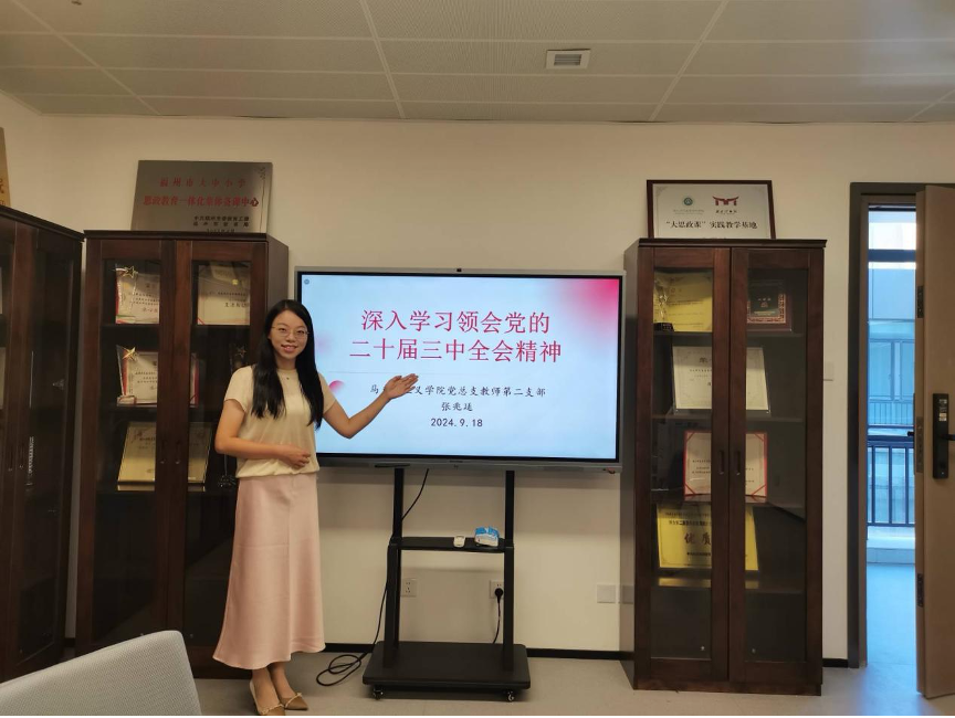 教师第二党支部书记张兆延首先从历史的角度梳理改革开放以来历届三中全会的情况,解读二十届三中全会中的新概念、新观点、新论断,强调进一步全面深化改革,要因地制宜发展新质生产力,在发展中保障和改善民生。之后,她引导党员教师深刻认识二十届三中全会的重大意义,推动党的二十届三中全会精神在教学工作中落地生根、开花结果。