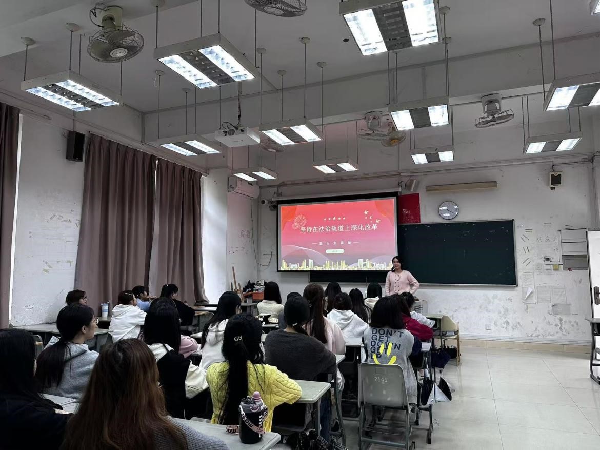 她围绕改革与法治的关系,阐述了在法治下推进改革、在改革中完善法治的重要性,勉励学生们要怀揣对法治的敬畏之心,积极参与法治建设和改革实践,用自己的实际行动为中华民族的伟大复兴贡献青春力量。