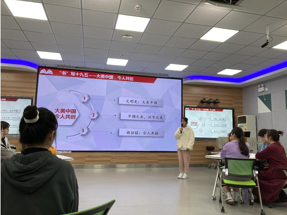观摩活动分为三个篇章,篇章一:迈向新征程。由读书社指导教师张兆延带头宣讲党的十九届五中全会精神,她首先从十九届五中全会的“时间节点关键、会议议题重要、会议成果重大”等三个方面强调了十九届五中全会的重大意义,其次带领社员一同学习了规划《建议》的主要看点。规划《建议》是开启全面建设社会主义现代化国家新征程、向着第二个百年奋斗目标进军的纲领性文件,是我们学习党的十九届五中全会精神的重点,张兆延老师从“1234569”这几个数字,带领社员们认识和理解规划《建议》的主要精神,并就规划《建议》的核心要义:新发展阶段、新发展理念、新发展格局进行了深入阐述。篇章二:奋进新时代。由读书社社员代表汇报“学习十九届五中全会精神”的体会与感悟。社员们从“诗”说十九五、“书”写十九五、“图”说十九五、“法”说十九五、“歌”颂十九五等不同方面汇报了我国十三五以来取得的巨大成就,分析了十四五时期发展目标及2035远景目标,联系自身实际,畅谈了未来五年、十五年个人发展目标,表示生逢其时,重任在肩,不辱使命。篇章三:开创新未来。指导教师张兆延总结强调,读书社社员要带头深入学习、宣讲党的十九届五中全会精神,带头用身边的人讲好身边的故事,希望大家不负青春、不负韶华、不负时代,站在时代潮头上,勇担时代重任,以青春之奋斗创造青春之中国,以青春之中国成就青春之你我。