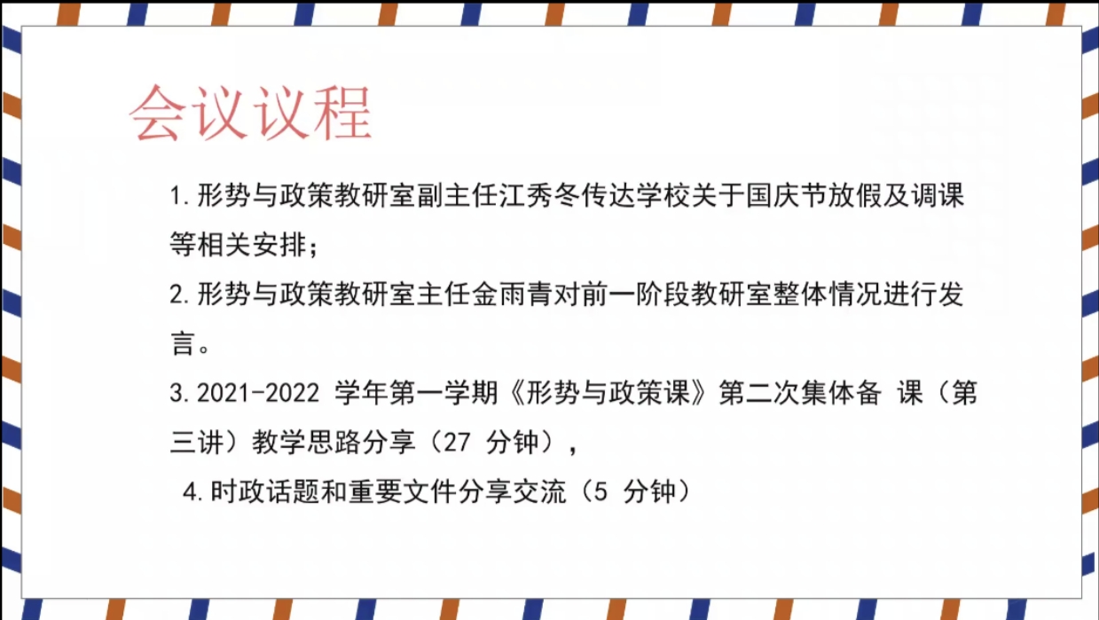 9月26日,“形势与政策”课教研室在腾讯会议召开本学期第二次教研活动,“形势与政策”课教研室全体教师参与。