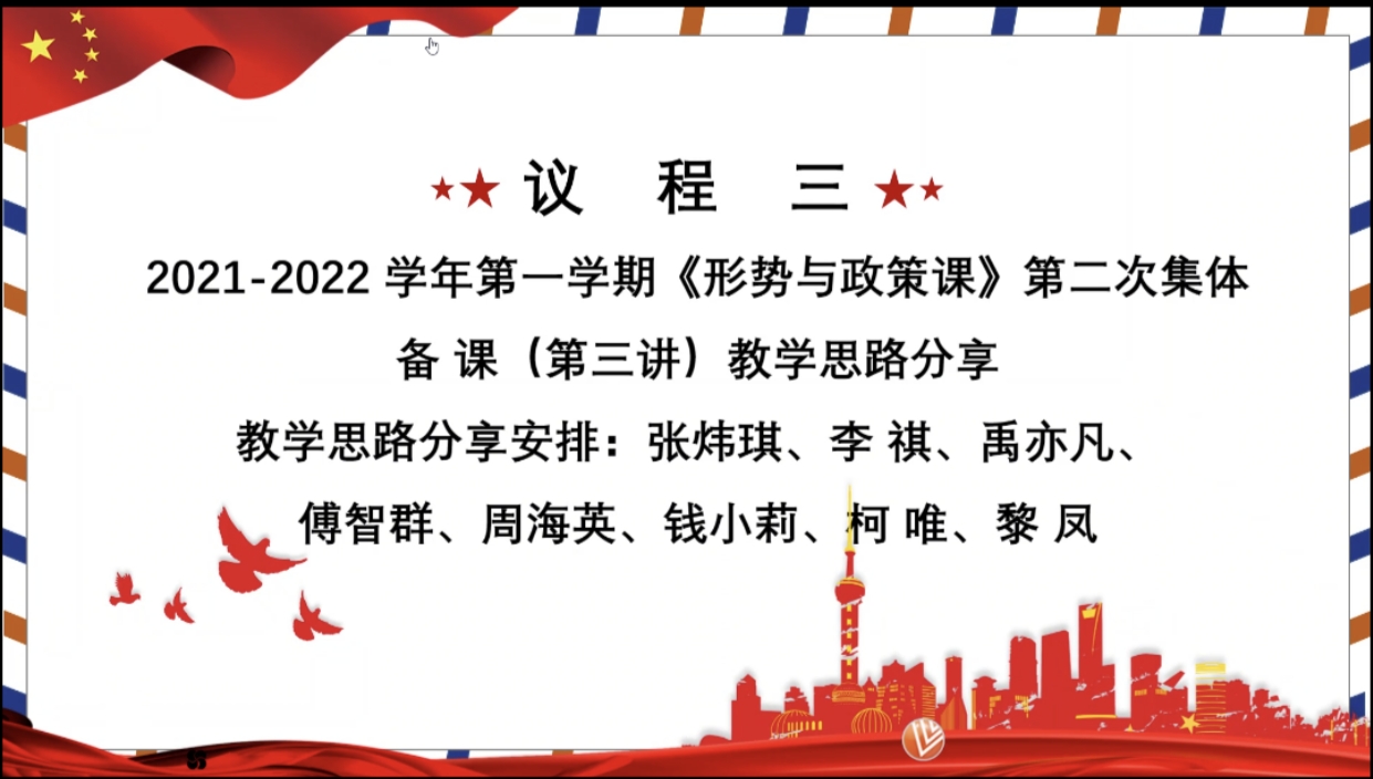 接着教研室进行本学期第二次集体备课研讨活动。张炜琪、李祺、禹亦凡、傅智群、周海英、钱小莉、柯唯、黎凤八位老师依次就第三讲“谱写乡村全面振兴新篇章”进行教学设计,明确教学目标,分享教学思路,突出教学重难点,提供丰富教学案例。