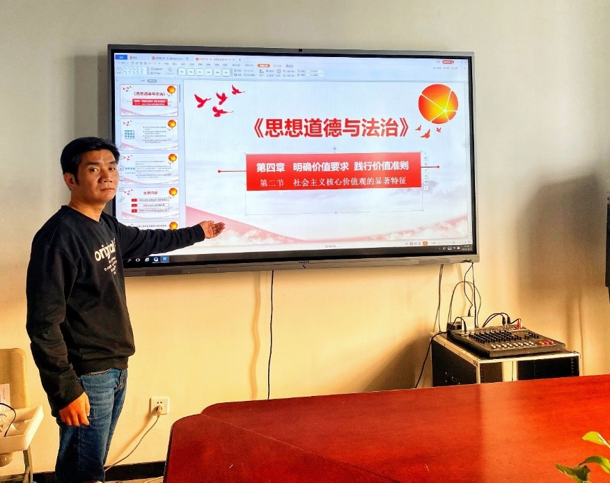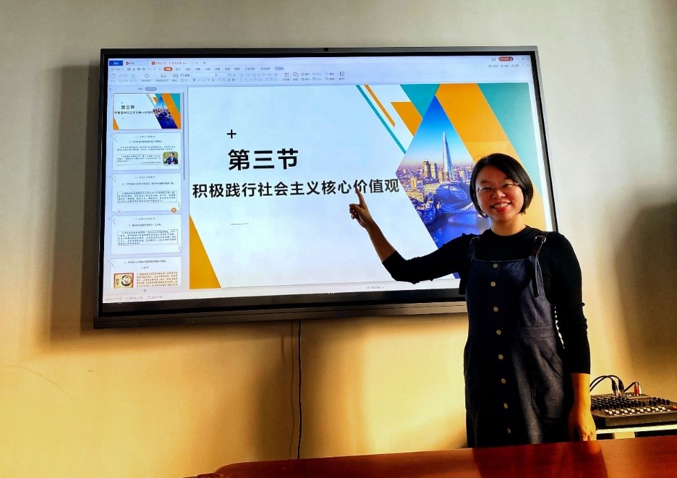 茅朝霞老师以“人生竞拍场”游戏导入价值观阐述,从价值观、核心价值观和社会主义核心价值观的逻辑关系展开论述。通过讲授事例、播放视频等教学手段,引导学生正确理解社会主义核心价值观的基本内容和重大意义。