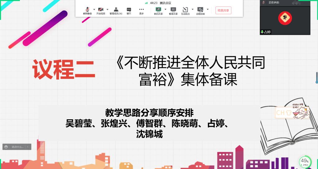 与会教师一起学习《习近平:摆脱贫困》、《李克强作的政府工作报告(摘登)》、《久久为功,走稳走实共同富裕之路(两会聚焦)》、《「两会时评」在高质量发展中扎实推进共同富裕》等重要文章,把学习内容与第二讲的教学紧密联系起来。最后,老师们还就3月以来的时政热点做进一步思考和分析,以期在教学中紧密联系社会最新发展方向和热点问题。