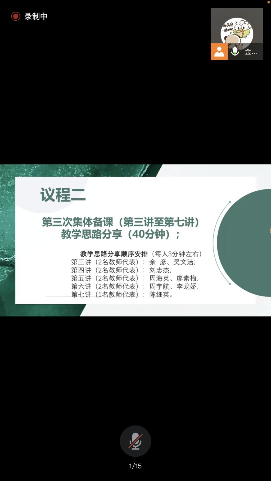 首先,教研室副主任金雨青老师针对第6、7周听课情况,就疫情防控期间线上教学提出要求:各位老师进行线上教学时应注意师生互动,布置的任务应能有效反馈学生学习情况。接着,集体备课活动正式开始,余彦、吴文洁、刘志杰、周海英、廖素梅、周宇航、李龙娇、陈细英8位老师分别根据第三讲至第七讲内容分享教学思路,联系最新时政热点,结合学生专业,突出教学重难点。
