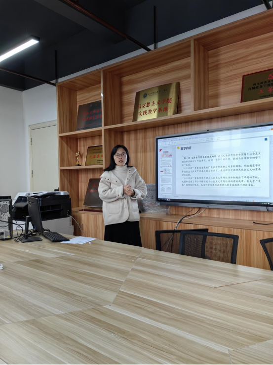 穆亮红首先介绍本学期教研室工作安排。之后,针对第一章教学内容进行说课,她分别从教学思路、学情分析、教学内容和重难点等方面展开教学设计,并辅之以丰富的教学案例来提升思政课教学实效性。最后,教研室各位老师针对教学重难点进行深入研讨,交流了改进教学方式方法的宝贵意见。