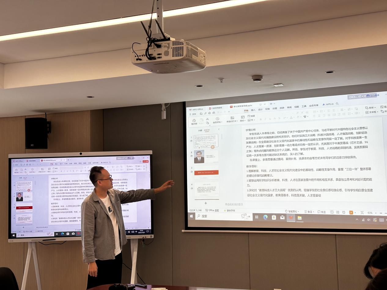 曾玉婷老师主讲第六章“推动高质量发展”的教学内容,她以新发展阶段、新发展理念、新发展格局为主线,阐释以新发展理念引领高质量发展,构建高水平社会主义市场经济体制和把握未来发展主动权,建设现代化经济体系。卓龙锋老师主讲第七章“社会主义现代化建设的教育、科技、人才战略”的教学内容,他围绕“教育、科技与人才”三者关系,从理论、战略和理念原则三个维度详细叙述为什么说教育、科技、人才是全面建设社会主义现代化国家的基础性、战略性支撑,教学中运用相关案例对加快建设教育强国、科技强国、人才强国进行具体阐释。与会老师针对教学目标、教学重难点及授课内容等进行分析讨论,提出教学建议。