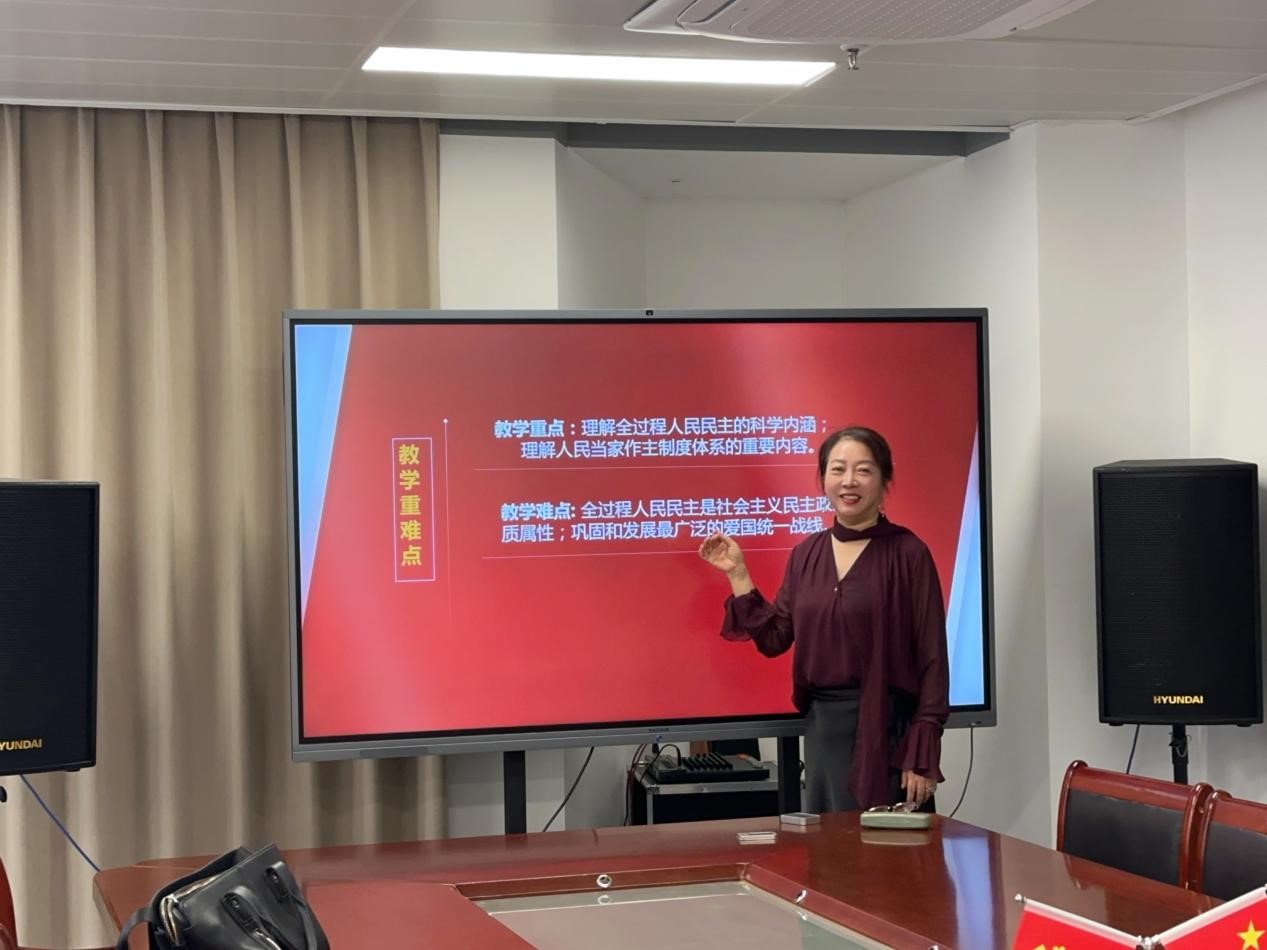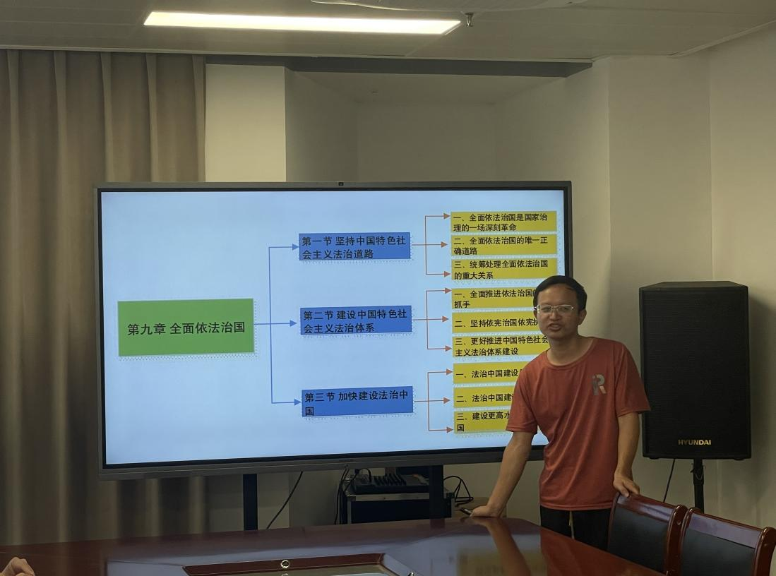 蔡玉榕老师主讲第八章“发展全过程人民民主”的教学内容,她从“坚定中国特色社会主义政治制度自信”“全过程人民民主是社会主义民主政治的本质属性”“健全人民当家作主的制度体系”“巩固和发展新时代爱国统一战线”四个部分展开论述。林钊安老师主讲第九章“全面依法治国”的教学内容,他从“坚持中国特色社会主义法治道路”“建设中国特色社会主义法治体系”“加快建设法治中国”三个部分展开论述,结合“全面依法治国”的重大意义,重点讲解中国特色社会主义法治道路的核心要义和基本原则,中国特色社会主义法治体系。
