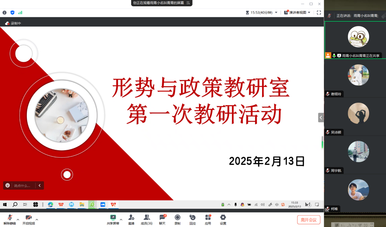 2月13日下午,“形策”教研室在线上开展新学期第一次教研室活动。首先,教研室主任金雨青对本学期的课时安排、教材征订情况、教学工作安排等方面进行工作部署。接着,她围绕“教育大国迈向教育强国”专题分享了教学思路,为教学重难点的突破提供了丰富的教学资源。