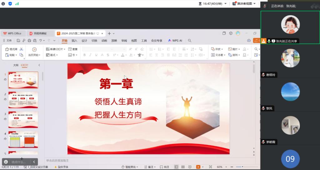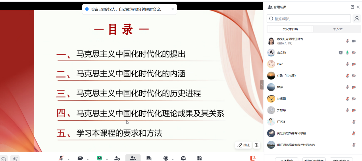 2月13日上午,“毛中特”教研室开展线上集体备课。本次集备由教研室林泽田老师主讲。首先,他围绕导论“马克思主义中国化时代化的历史进程与理论成果”进行说课。他从教材内容入手,结合学生的学情,详细解读了导论中“为什么要实现马克思主义中国化时代化”“马克思主义中国化时代化的科学内涵、历史进程和理论成果”等重要知识点。随后,翁文纯老师选取导论章节中“马克思主义中国化时代化的提出”进行片段教学。他通过精心设计的教学环节和互动方式,生动地呈现了如何向学生阐明“为什么要实现马克思主义中国化时代化”这一重要问题。在集体讨论环节,老师们针对说课和片段教学情况以及导论章节的教学重难点展开热烈讨论和交流。