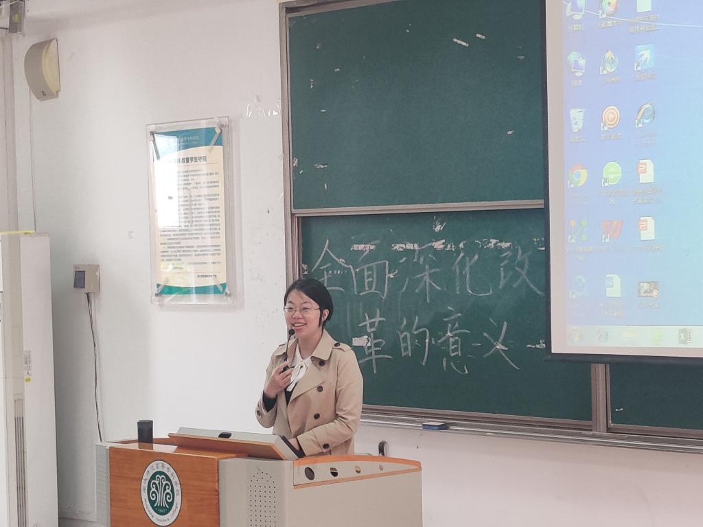 接着,读书社社员代表分享各自的学习体会与感悟。刘静楠同学分享了《理解深化改革的方向性、立场性和原则性》,表示全面深化改革要坚持社会主义方向,始终站稳人民立场,始终坚持中国特色社会主义制度不动摇。社员王烨莹通过阅读《全面深化改革的意义》,表示唯有不忘初心,全面深化改革,才能收获美好生活。