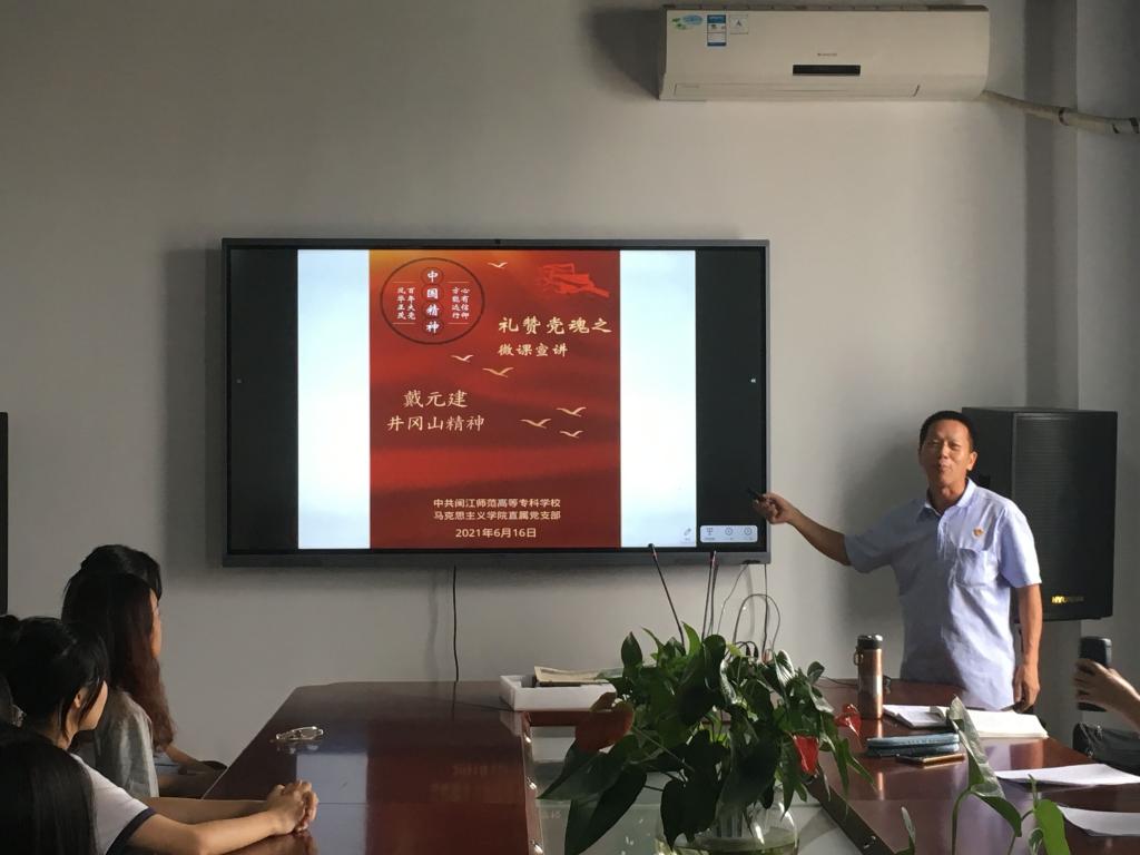 马克思主义学院直属党支部每位党员教师根据共产党的精神谱系,分别宣讲:古田会议精神、长征精神、抗美援朝精神、延安精神、才溪乡调查精神、苏区精神、井冈山精神、西柏坡精神、红船精神、樵夫精神--廖俊波。