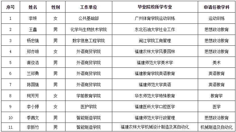 根据《福建省教育厅关于做好2023年秋季高等学校教师资格认定工作的通知》(闽教师〔2023〕56号)精神,经研究,李妍等11名同志符合2023年秋季高校教师资格申报条件,予以推荐。