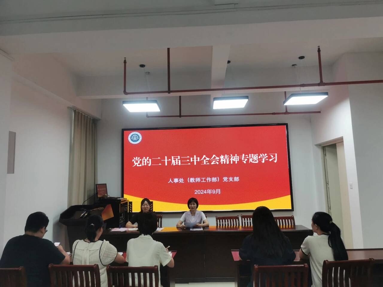 9月14日,人事处(教师工作部)党支部召开党的二十届三中全会精神专题学习交流研讨会。会议由党支部书记吴春艳主持,全体党员参加。