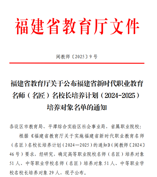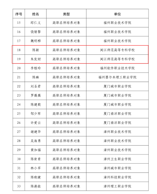 近日,福建省教育厅公布了福建省新时代职业教育名师(名匠)名校长培养计划(2024-2025)培养对象名单,大赢家体育app下载陈颖、朱发财两名教师入选福建省高职名师培养对象。