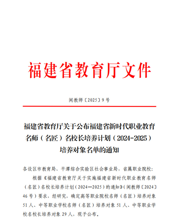 根据《福建省教育厅关于公布福建省新时代职业教育名师(名匠)名校长培养计划(2024-2025)培养对象名单的通知》,大赢家体育app下载徐青同志入选福建省中职名校长培养对象,张林娜同志入选福建省中职名匠培养对象。