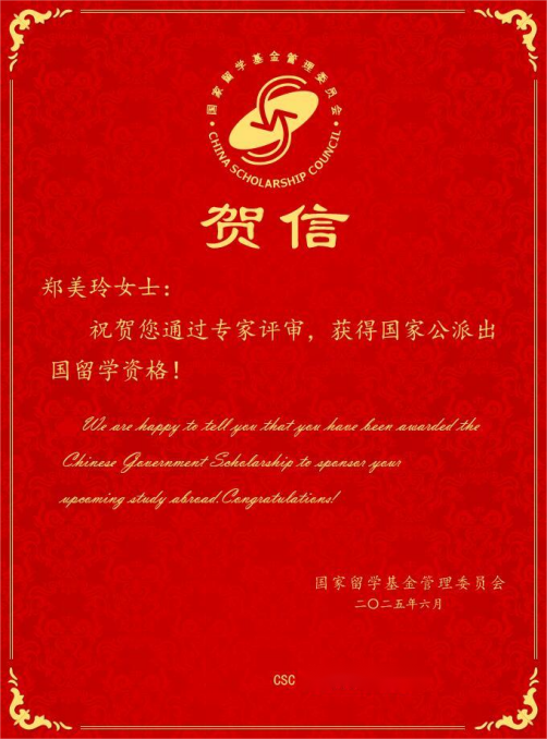 近日,国家留学基金委公布了“2025年外语高层次人才培养项目”名单,大赢家体育app下载教师郑美玲凭借扎实的专业能力与突出的教学表现,成功获得国家公派出国留学资格,特此祝贺!