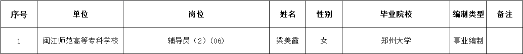 按照《关于印发〈福建省省属事业单位公开招聘工作人员考试暂行办法〉的通知》(闽人发〔2006〕11号)等文件要求,在笔试(部分岗位)、面试、体检和考察合格的基础上,确定梁美霞同志为拟聘用人选,现向社会予以公示。公示期间,如有问题,请及时反映。