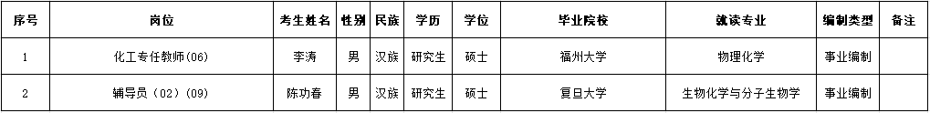 按照《关于印发〈福建省省属事业单位公开招聘工作人员考试暂行办法〉的通知》(闽人发〔2006〕11号)等文件要求,在笔试、面试、体检和考察合格的基础上,确定陈功春、李涛等2位同志为拟聘用人选,现向社会予以公示。公示期间,如有问题,请及时反映。