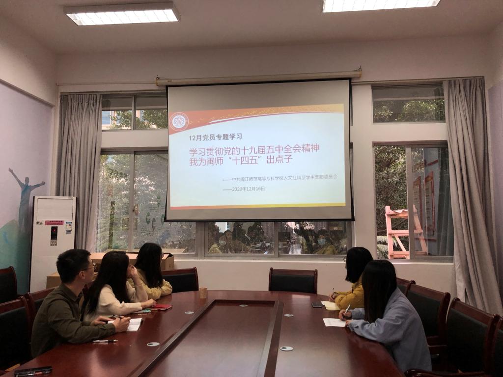 为深入学习贯彻党的十九届五中全会精神,全面贯彻党的教育方针,落实立德树人根本任务,12月16日中午,人文社科系学生党支部召开12月份支部理论学习会议,本次活动由叶懿蛟主持,支部全体党员参加了本次会议。