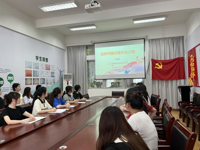为深入学习宣传贯彻党的二十大精神,巩固拓展党史学习教育成果,营造“讲党课、上党课、学党课”的浓厚氛围,6月14日,人文与管理学院学生党支部书记叶懿蛟于在3-301会议室讲授“走好中国式现代化之路”主题党课,支部全体党员参加。