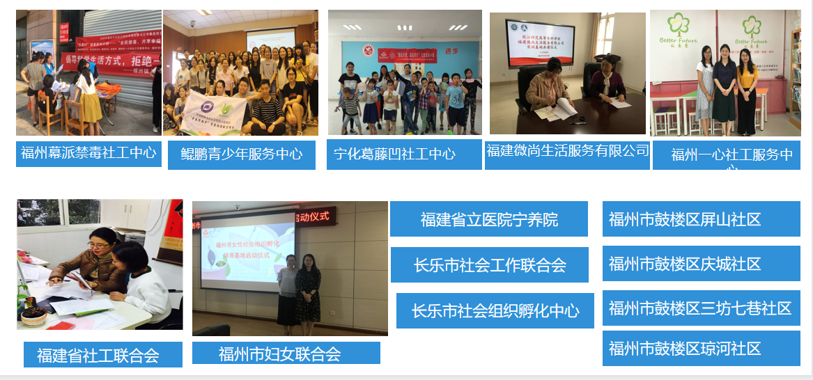 同时还有福建省立医院宁养院、福州市一心社会工作服务中心、福建省助困公益等社会服务组织和社区用来开展校外实训。