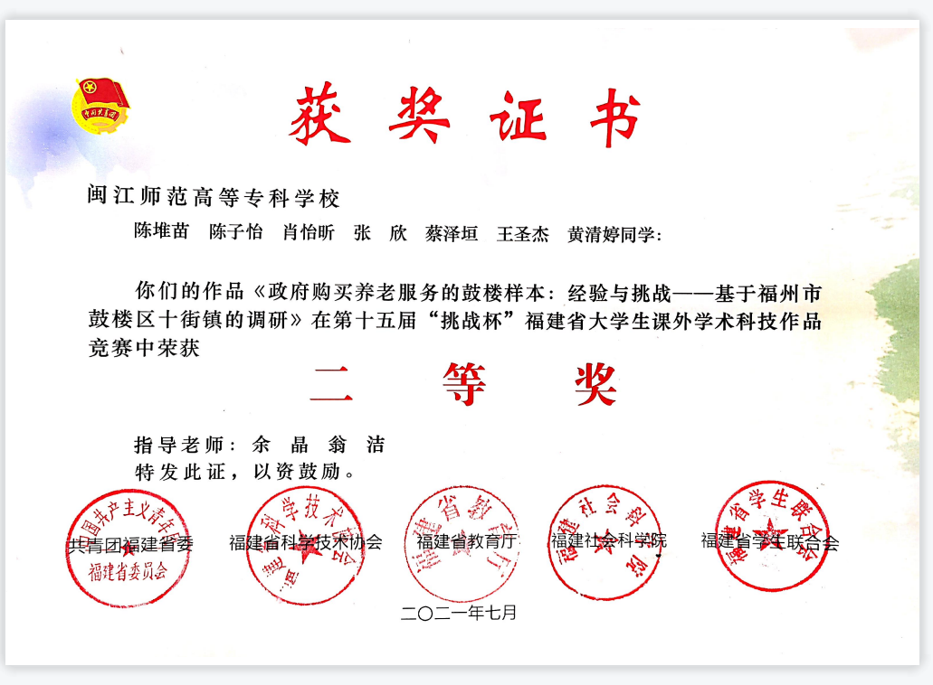简介:中共党员,助理社会工作师,曾获2019年闽江师专优秀毕业生,2018年福建省”创青春“大学生公益创业大赛铜奖,2022年3月在家乡组织抗疫事迹获漳州市委机关报《闽南日报》报道